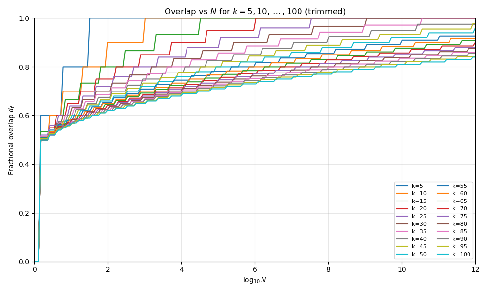 This first figure is a heatmap. We vary \(\log_{10}N\) on the x-axis and \(k\) on the y-axis. The color of the grid depends on \(d_f\).