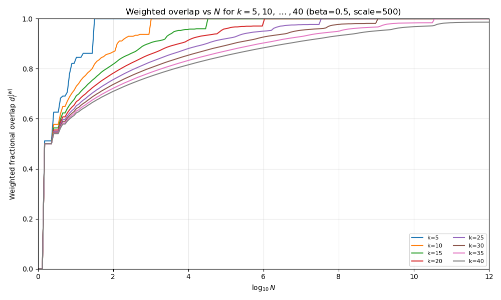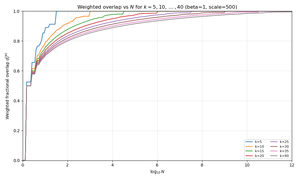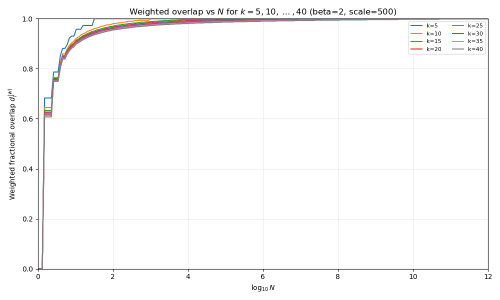 This is our “slow drop off” case. In the \(0 < \beta < 1\) regime, the earlier bit-weight analysis gave a polynomial growth of the effective “diameter” with \(k\),