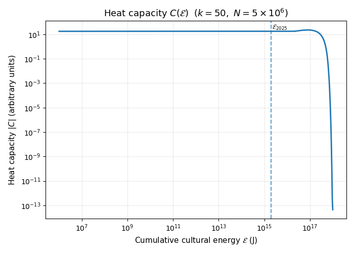 When \(C(E)\) is large, adding energy changes \(T\) slowly. This corresponds to a regime where there is still a lot of unexplored semantic volume, and we can keep investing in new works without running out of “cheap” novelty.