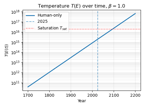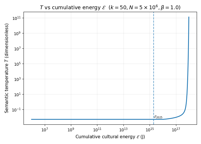 Regardless, under these assumptions, the qualitative picture is straightforward. At first, additional energy buys a lot of entropy. The system is “cold”, and new works carve out genuinely new regions of semantic space. As cumulative energy grows, the effective temperature \(T(E)\) remains roughly flat for a while, then begins to rise rapidly as we enter the crowded regime. Beyond that point, most of the marginal energy goes into producing works that sit inside already-populated neighborhoods in story space, rather than opening up genuinely new directions.