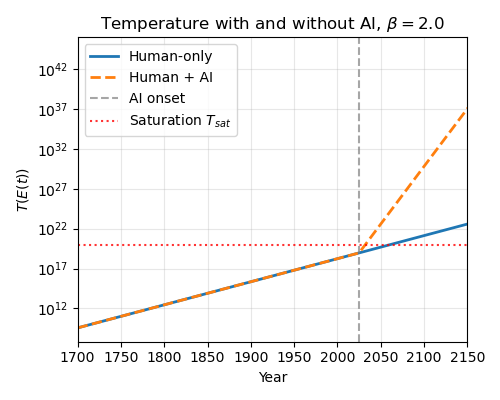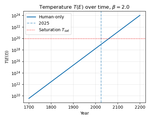 These are toy graphs. The saturation level is arbitrary. In the above graphs I’ve just set it to 10x the current temperature. But we can see that the saturation point could be quite close, especially if we think \(\beta\) is high.